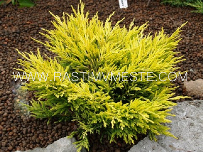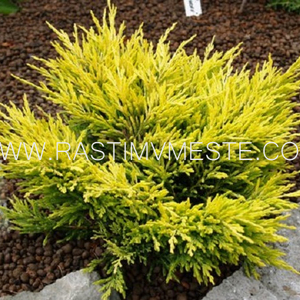 Представляет собой замечательный образец оригинального карликового кустарника с симметричной распростертой округлой плотной кроной канареечно-лимонного цвета. Высота взрослого растения – 0,4 м, диаметр – 1,5 м. Хвоя очень мелкая, игольчатая осенью становится бронзовой. Молодые растения летом полностью желтеют, взрослые растения окрашиваются в золото только в верхней, обращенной к солнцу, части, оставаясь зелеными снизу. Поэтому обязательным условием высокой декоративности этого сорта является солнечное местоположение.