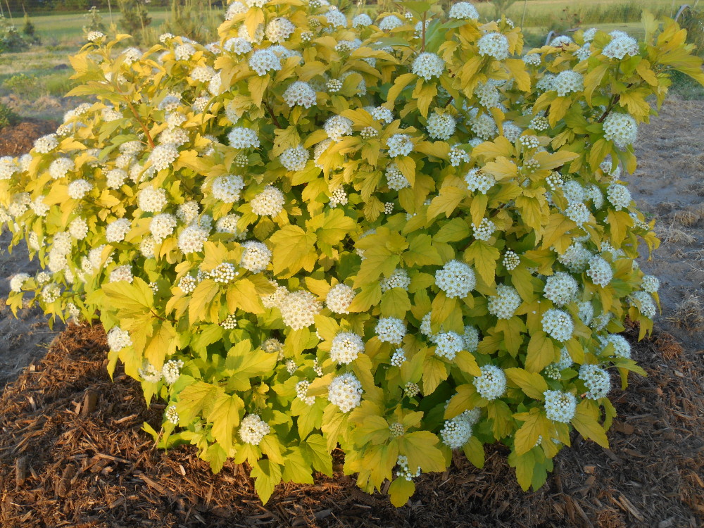 Пузыреплодник - раскидистый куст с поникающими ветвями, которые образуют густую , полушаровидную форму. Цветет в июне. Листья овальные, 3-5 лопастные, жёлтые, в тени зеленовато-желтые.