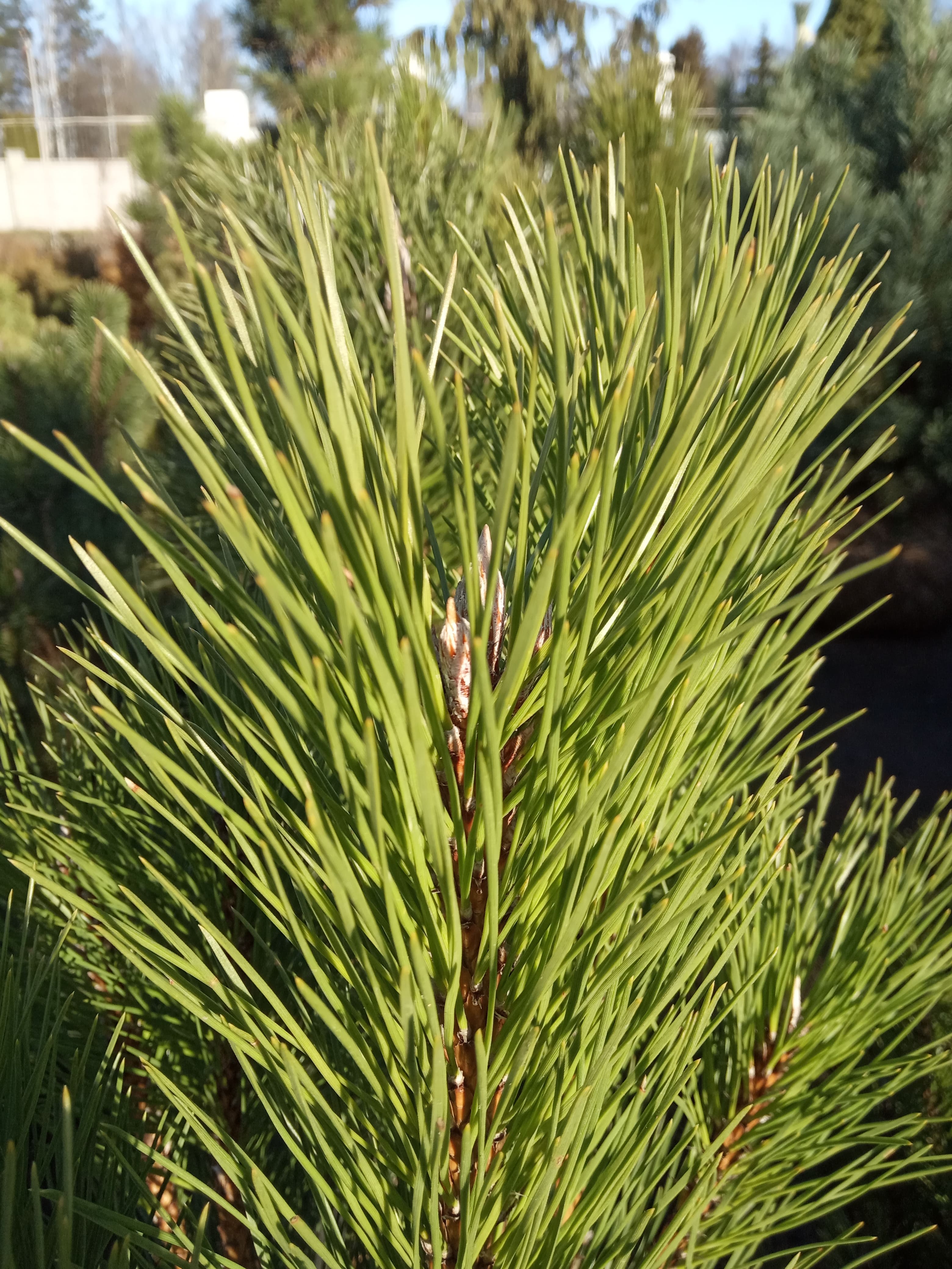 Иголочки собраны по 2 штучки. Хвоинки жесткие, толстые, зеленого цвета с серым и синеватым оттенками, живут 2-5 лет, затем опадают.